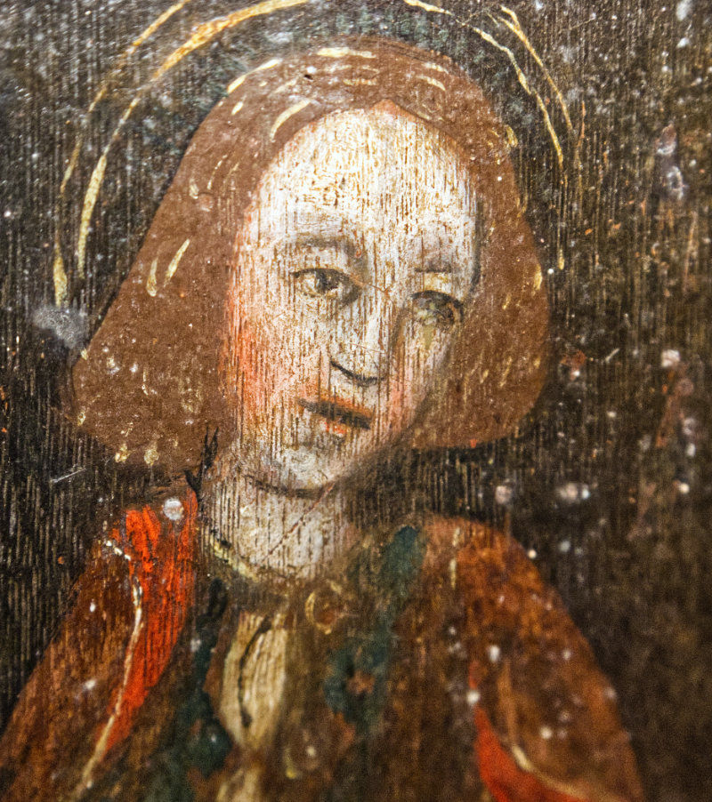A word of warning about the paintings on the reredos. These have been here less than 100 years but something is seriously wrong with the way they have been applied, as you will see from the detailed images. Several of the figures have lost large areas of paint and at this rate of degradation I would suggest that the church authorities need to act pretty fast to have these assessed by a restorer before irreparable harm is done. Of course this may already be in hand.