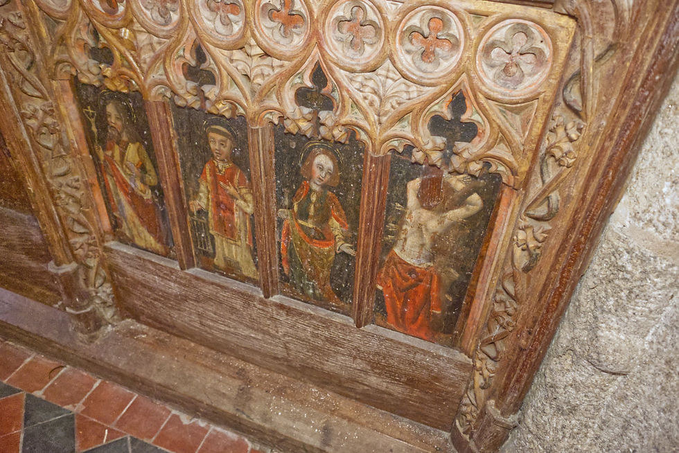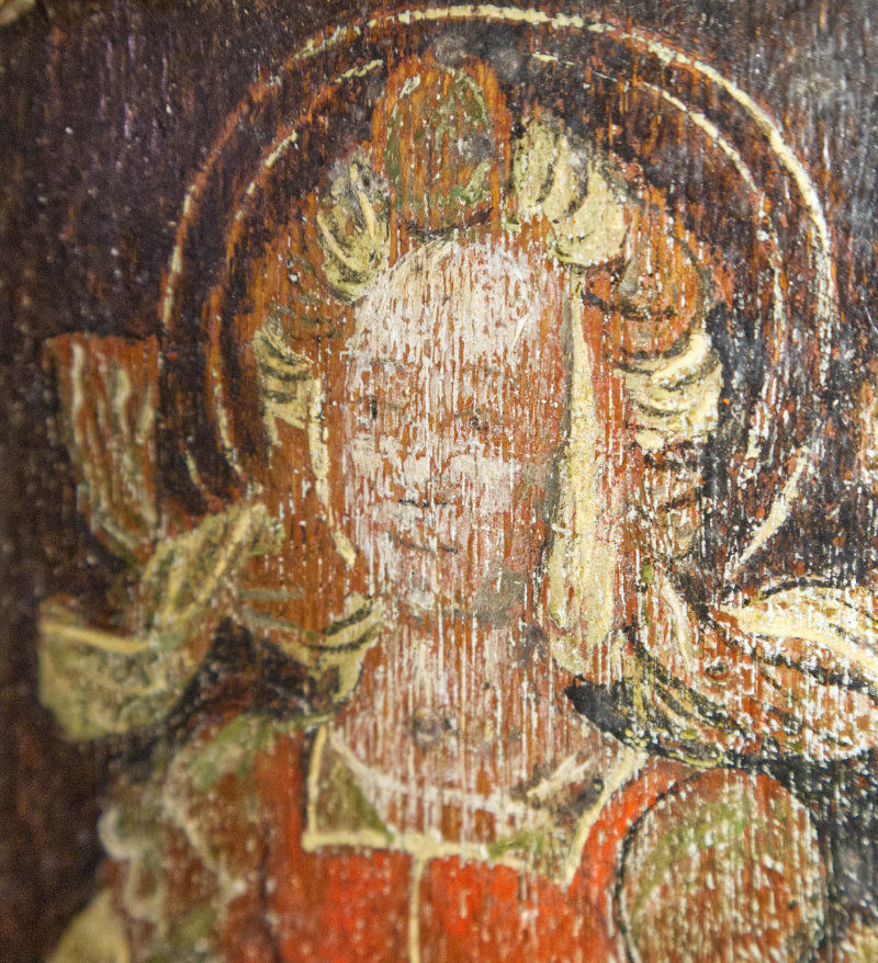 This is a selection of details from the 15th century painted figures on the rood screen of East Portlemouth church in South Devon, characterful faces that have peered out at the congregation for 500 years. Saints over the centuries acquired traditional manners of portrayal in an era when most people were illiterate. How they are dressed or what they carry are clues to their history, so I have added where possible brief descriptions. The church itself is covered in a separate post here.