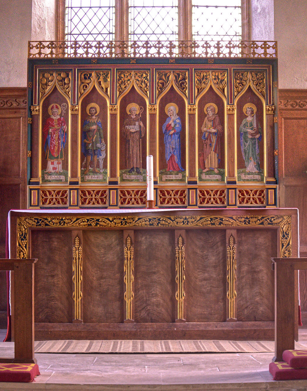 The new altar, priest’s stalls and reredos (painted by Gerald Smith) were all designed by Sir Charles Nicholson in the 1934 restoration. The altar is of oak and walnut, bearing a carved and gilded design of wheat and wine, emblems of the Blessed Sacrament. The paintings in the reredos represent St. Nicholas, St. Hubert, St. Winwaloe, the Virgin Mary, St. Martha and St. Cecilia.